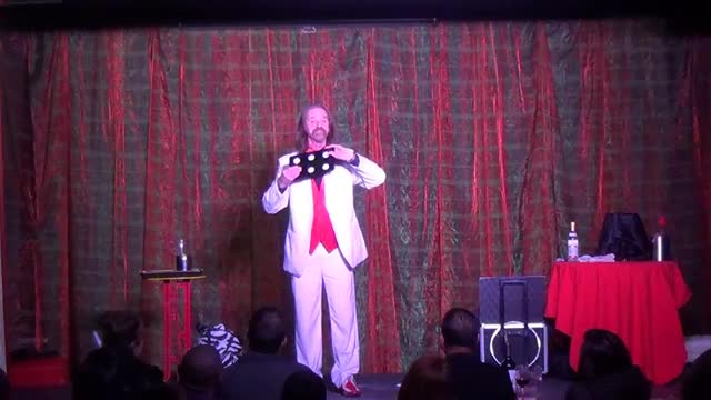 The performer explains that he will place the audience under a mild hypnotic spell and demonstrate an optical illusion in the form of a card with four(?) sides. True to form the magician proceeds to show a large domino-like card. One spot on one side, four on the other, then three on the third(?) side and six (?) on the other! This is shown two more times and then the performer explains the psychological and manual manipulation that creates the illusion of a four sided card. Due to the way the card is held the spots are either displayed or covered by the fingers and the minds of the audience create the illusion of a four sided card. Then things get strange when the performer shows that the illusions have become a reality and spots start magically appearing at every turn of the card. Finally in one final turn of the card, it is suddenly filled with white dots bringing the routine (and hypnotic spell!) to a mind blowing conclusion!
