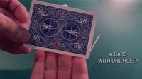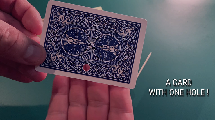 Show the card to your spectators, this blue card has a single hole on the long side, a hole in the center of the length.