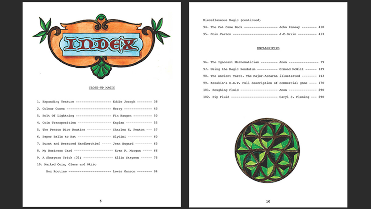 The 359 pages of this book contains 97 effects for close-up - stage - mentalism - children, etc. Taken from written instructions and books, to watched performances and word of mouth instruction. Here are the cherished ideas of Annemann, Stanley Collins, Paul Curry, Cy Endfield, Robert Harbin, R.W. Hull, Stewart James, Jordan, Milton Kort, Ed Marlo, Clayton Rawson, Harlan Tarbell, Edward Victor and many more.