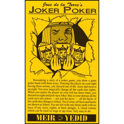 Recounting a story of a poker game: you show a giant poker hand with three sixes. Noticing the player on your right having three sevens, you discard one of the sixes and receive an eight. You now magically change all of the cards into eights. When you notice the player on your left has three nines, you discard an eight and pick-up a Joker. But, to your dismay all the cards turn into jokers - not just the faces - all the backs of the cards also change to Jokers. Yes it`s true, all face and backs are shown as Jokers! You are left with only three cards with no trace of any sixes, eights, or back designs. A visual routine which can be used on stage or up-close.