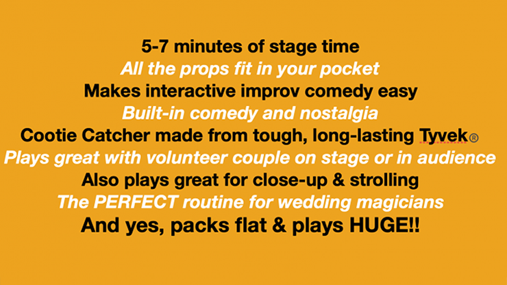 - 1 Custom-made, virtually indestructible, 18X18 inch stage-size Tyvek Cootie Catcher, created by the magician who originated Cootie Catcher magic.