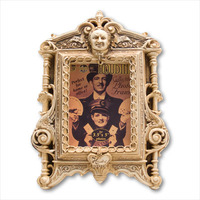 A beautifully sculpted miniature likeness of Houdini, tops this exquisitely detailed photo frame. The tiny bas-relief bust is flanked by banners heralding the birth and death dates of Houdini. Matching pillars, encircled by winged dragons, complete the look of an elaborate theatrical proscenium. Chains and padlock terminate at the bottom center with a crown, enscribed "Houdini", signifying his status as the king of escape artists. Your favorite, standard-sized photo, stars centerstage! - Easel back for shelf or table display. Showcase Your Favorite Photos!