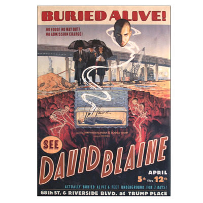 David blaine's Thrird poster, April 5th, 1999 at Trump Park, 68th Street at the West End Avenue(Riverside Place) is where David was buried alive for one week under six feet of Plexiglas tank filled with 4000 pounds of water, an attempt no other magician has ever done.