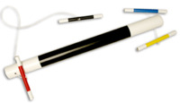 A large wand is shown. It has a long string on one side and a short string on the other. Tied to these strings are four smaller wands, a red one, a black one, a yellow one and a blue one. No matter which of the small wands is pulled out, it always raises the one already out.
