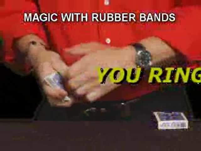 1.You Ring? - A ring is borrowed, a rubber band is held at the fingertips of the right hand and placed through the center of the ring. A second rubber band is placed behind the other rubber band using your left hand. The spectator holds the ring as the bands instantaneously penetrate through the ring and each other and the spectator is left holding the ring with the rubber bands still at the fingertips of your hands.