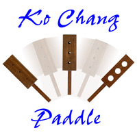 A beautiful teak wood paddle with three small holes is displayed, and shown on both sides.