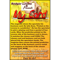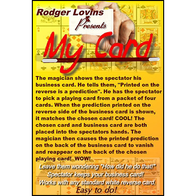 The magician shows the spectator his business card. He tells them, "Printed on the reverse is a prediction." He has the spectator choose a playing card from a packet of four cards. When the prediction printed on the reverse side of the business card is shown, it matches the chosen card! COOL! The chosen card and business card are both placed into the spectators hands. The magician then causes the printed prediction on the back of his business card to vanish and reappear on the back of the chosen playing card! The other three playing cards are turned over to show that no printing is found on them. WOW! The magician then gives the spectator his business card to keep! Your business card is in plain view at all times. It never leaves there sight! Only one business card is used, Yours! No switching of cards. No fancy moves!